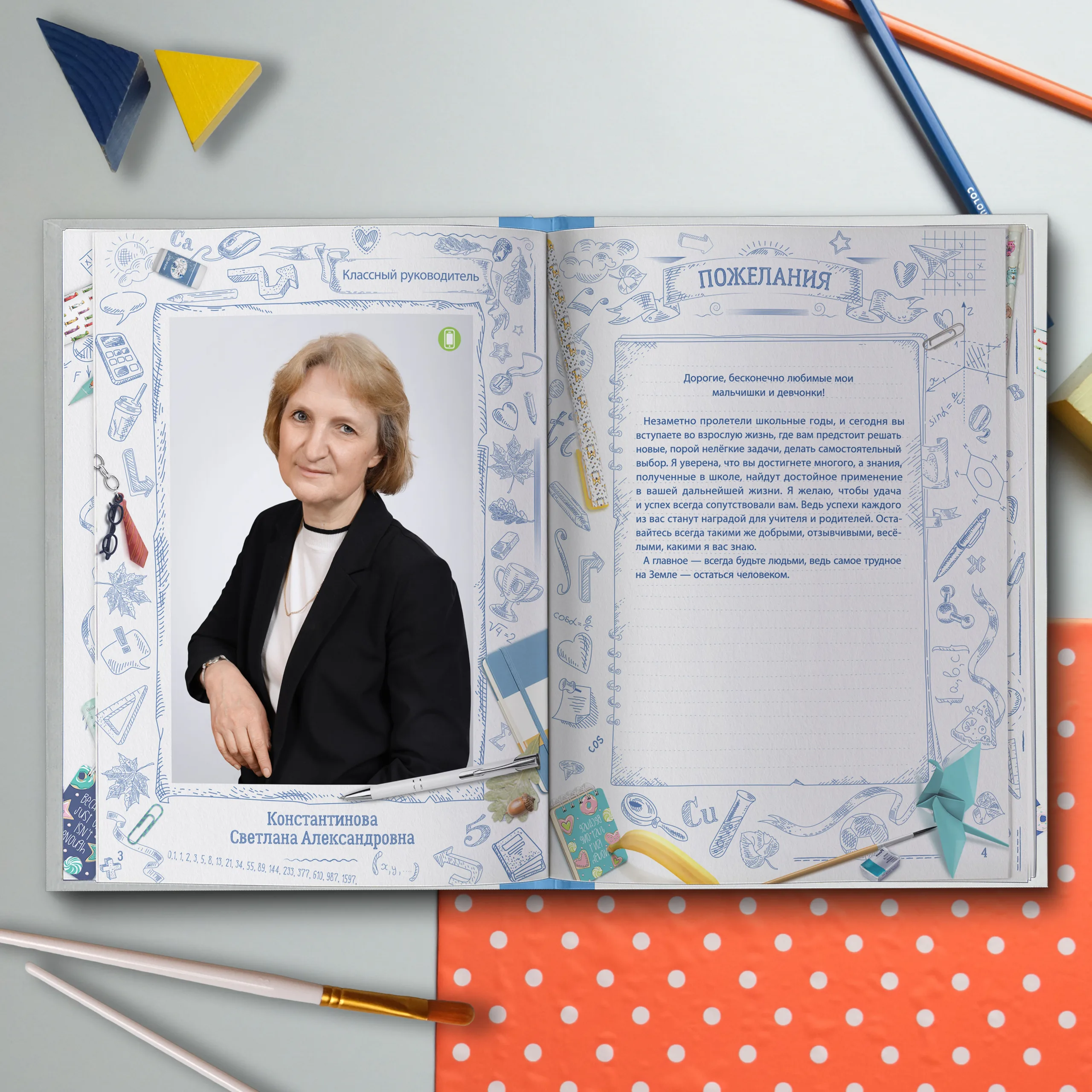1ый разворот — виньетки педагогов и фотография классного руководителя с напутственным словом