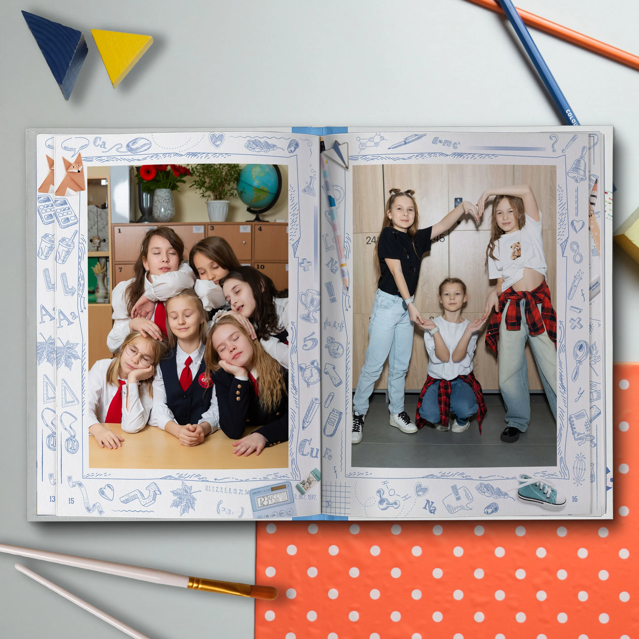 Полюбившийся многим дизайн теперь в светлом оформлении. Яркие кадры юности на фоне, напоминающем изрисованную тетрадь, непременно окунут выпускников в приятные воспоминания. Выпускной альбом в классном современном дизайне не оставит равнодушным ни одного ученика.